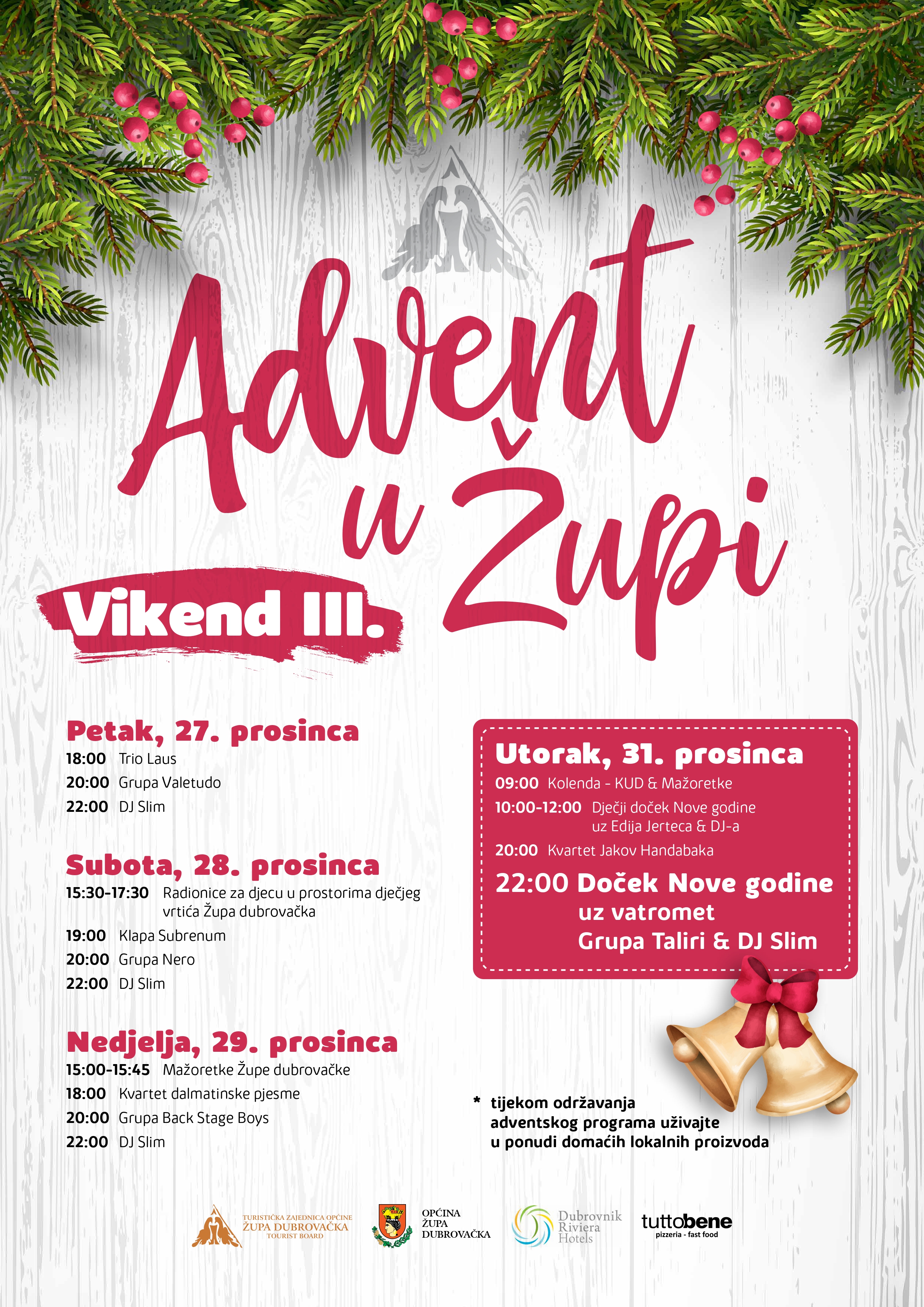 Aktualno Bogat program za posljednji vikend župskog Adventa 27. prosinca 2019.Piše: ŽupaNet portal Piše: ŽupaNet portal Podijeli vijest! Facebook Twitter Google Plus Pinterest LinkedIn Pogledajte srodne članke Aktualno • IZDVAJAMO Značajan porast dolazaka i noćenja u Župi dubrovačkoj 9. travnja 2026. Aktualno • IZDVAJAMO • Županija Uskrsna čestitka župana Blaža Peza 5. travnja 2026. Aktualno • IZDVAJAMO • Konavle Uskrsna čestitka načelnika Boža Lasića 5. travnja 2026. Rekonstrukcija dijela ceste u Mandaljeni do mosta na rijeci Taranta Kako je glasovala Župa? Donosimo rezultate prema biračkim mjestima Podijeli vijest! Facebook Twitter Google Plus Pinterest LinkedIn Najčitanije iz ove rubrike Aktualno • IZDVAJAMO KAPETANE, ODMORI SE, ZASLUŽIO SI! Luka Modrić u Župi dubrovačkoj FOTO Aktualno • IZDVAJAMO Župa je dobila novu pizzeriju! Pogledajte tko je bio na otvaranju FOTO Aktualno • Župske priče - Maro Zec KUPARI OSAMDESETIH GODINA Aktualno Župska nedjeljna mini ŠPICA :) Aktualno Pogledajte fotogaleriju župske špice!