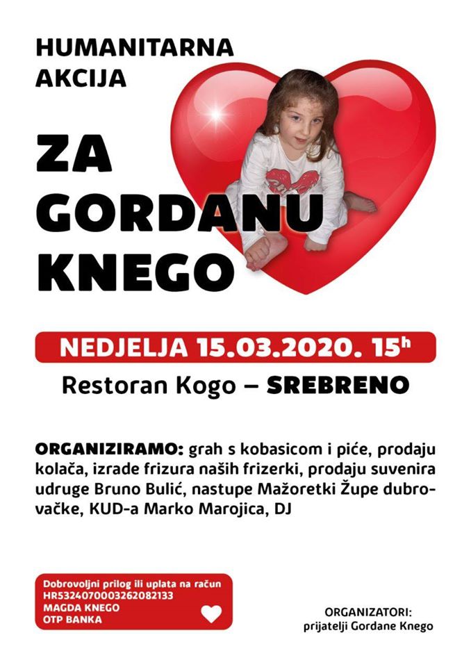 S obzirom na najnovije preporuke o ograničavanju organiziranih skupova zbog epidemije koronavirusa, odgođena je i Humanitarna akcija za Gordanu Knego koja se trebala održati ove nedjelje u Restoranu Kogo. Novi termin objavit će se naknadno – poručuju organizatori.