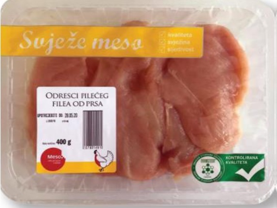 Ministarstvo poljoprivrede obavještava potrošače o opozivu proizvoda Odresci pilećeg filea od prsa, 400 g, LOT broja L 200514, upotrijebiti do 23.05.2020., radi utvrđene bakterije Salmonella ser. Enteritidis.