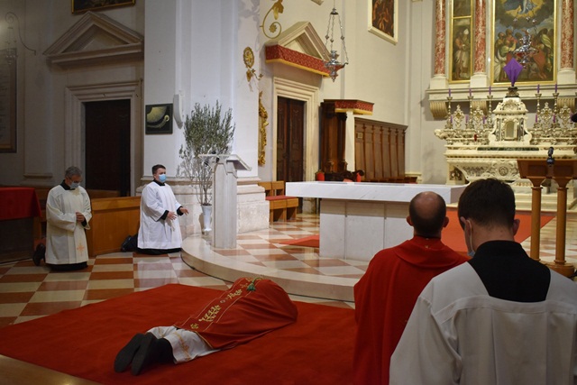 Nakon prostracije nadbiskupa i klečanja svećenika, bogoslova, sjemeništaraca, ministranata i ograničenog broja vjernika ispred ogoljelog oltara i otvorenog svetohraništa, nastavljena je služba riječi. Nadbiskup Uzinić je na početku propovijedi kazao kako bogoslužje Velikog petka ima tri djela, te i da u prvom dijelu slušamo o tome što se dogodilo Isusu.