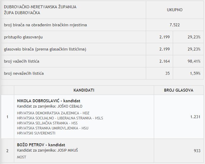 U Župi dubrovačkoj glasovanju je pristupilo 2.199 glasača. Dobroslavić je dobio 1.231 ili 55,98 posto glasova, a Petrov 933 ili 42,43 posto.