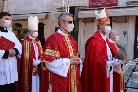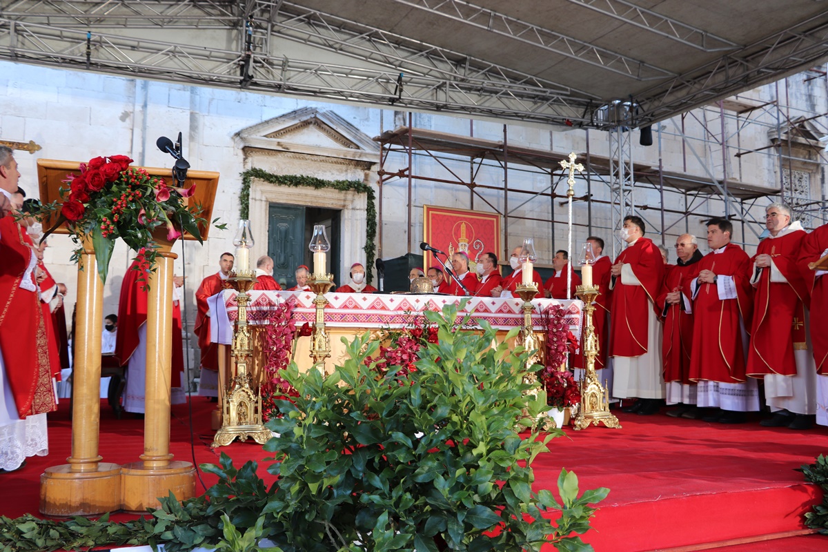 Biskupi i nadbiskupi koji su sudjelovali na slavlju 1050. obljetnice zaštite sv. Vlaha naizmjenično su nosili najljepšu relikviju moći glave sv. Vlaha. Relikviju Isusove pelenice i baldahin nosili su vjernici u narodnim nošnjama iz Konavala.