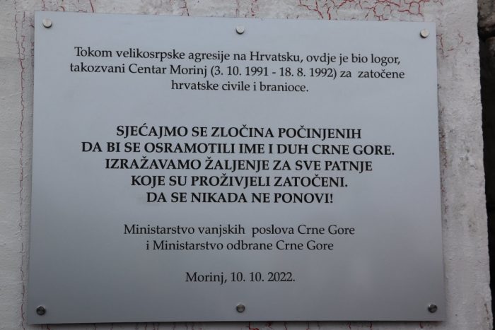 Sjećamo se zločina počinjenih da bi se osramotilo ime i duh Crne Gore. Izražavamo žaljenje za sve patnje koje su proživjeli zatočeni. Da se nikada ne ponovi! – stoji na spomen-ploči, uz podatak da je tijekom velikosrpske agresije na Hrvatsku na tom mjestu od 3. listopada 1991. do 18. kolovoza 1992. bio logor, tzv. Centar Morinj, za zatočene hrvatske civile i branitelje.