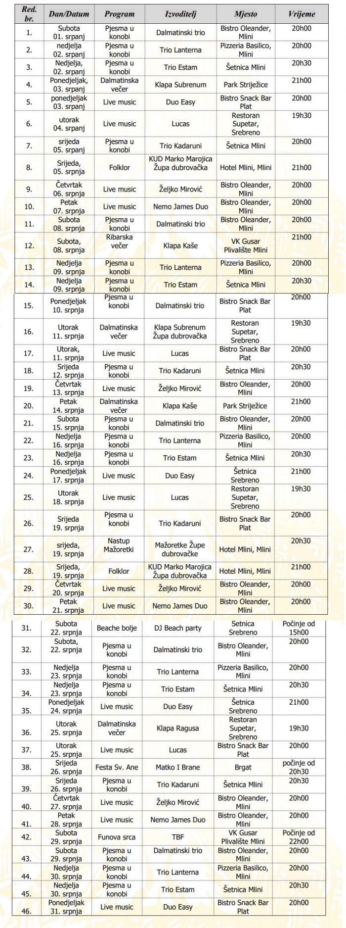 Program Župskog ljeta donosi čak 46 događanja u srpnju. Jedno od očekivanih događanja je tradicionalna zabava na Svetu Anu na Brgatu u srijedu 26.srpnja, koja će se održati uz nastupe Matka i Brane, te Funova srca na plivalištu Gusara u Mlinima, 29. srpnja, uz poseban nastup TBF-a. Popularni Beache bolje DJ Beach party udruge Ponat bit će održan 22. srpnja.